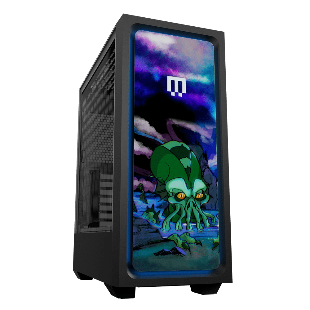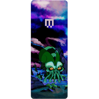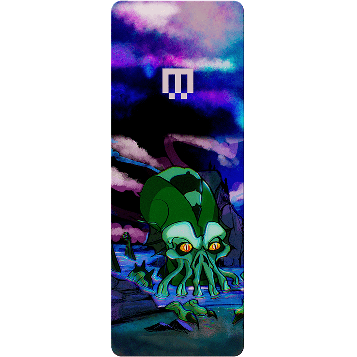 Paying homage to Lovecraft’s mythic god of the deep, this piece depicts Cthulhu’s ascent in a kaleidoscope of light and shadows.